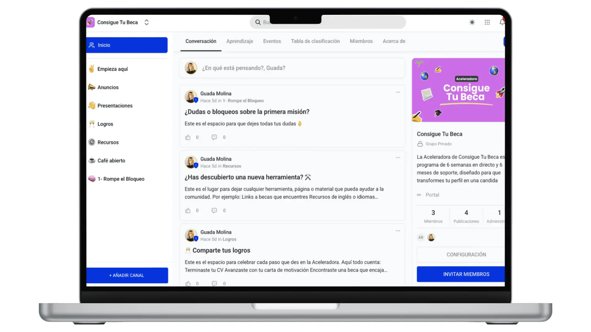 Es como tener una mini mentoría grupal continua, con acceso directo a mí y a todo lo que otras personas están aprendiendo también.